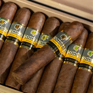 Cohiba Maduro 5 Mágicos Box of 25 delivers a rich and dark expression of Cohiba. The 5-year aged Maduro wrapper reveals cocoa, coffee, aged wood, and warm spice in a dense, elegant smoke lasting approximately 50–60 minutes.